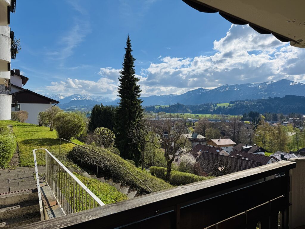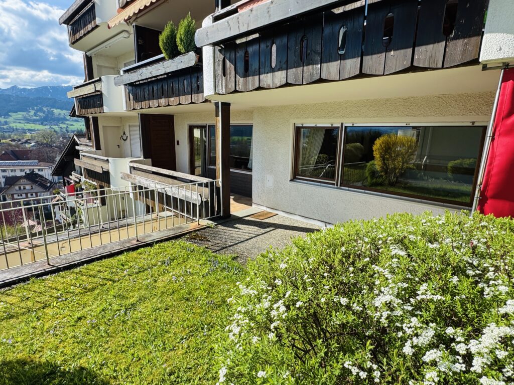 Die großzügige 3-Zimmer-Wohnung mit ca. 72 m² Wohnfläche befindet sich im ersten Obergeschoss eines gepflegten Mehrfamilienhauses in ruhiger Hanglage. Ein gut geschnittener Grundriss empfängt Sie mit einem praktischen Eingangs- und Garderobenbereich, der neben einem separaten Gäste-WC auch den Zugang zum hellen, großzügigen Wohnzimmer bietet. Dieser zentrale Wohnbereich überzeugt mit großen Fenstern mit gigantischer Sicht, elektrischen Rollläden, Zugang zur abschließbaren Küche, sowie einem direkten Ausgang auf den sonnigen Südbalkon – ein echtes Highlight, denn nur diese Wohnung im Haus bietet zusätzlich eine kleine Terrasse mit einer kleinen Gemeinschaftsrasenfläche. Mit voller Südausrichtung kann man hier rund um die Uhr einen herrlichen Panoramablick in Richtung Oberstdorfer Berge genießen.