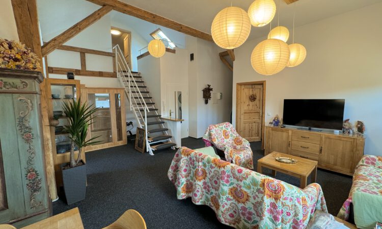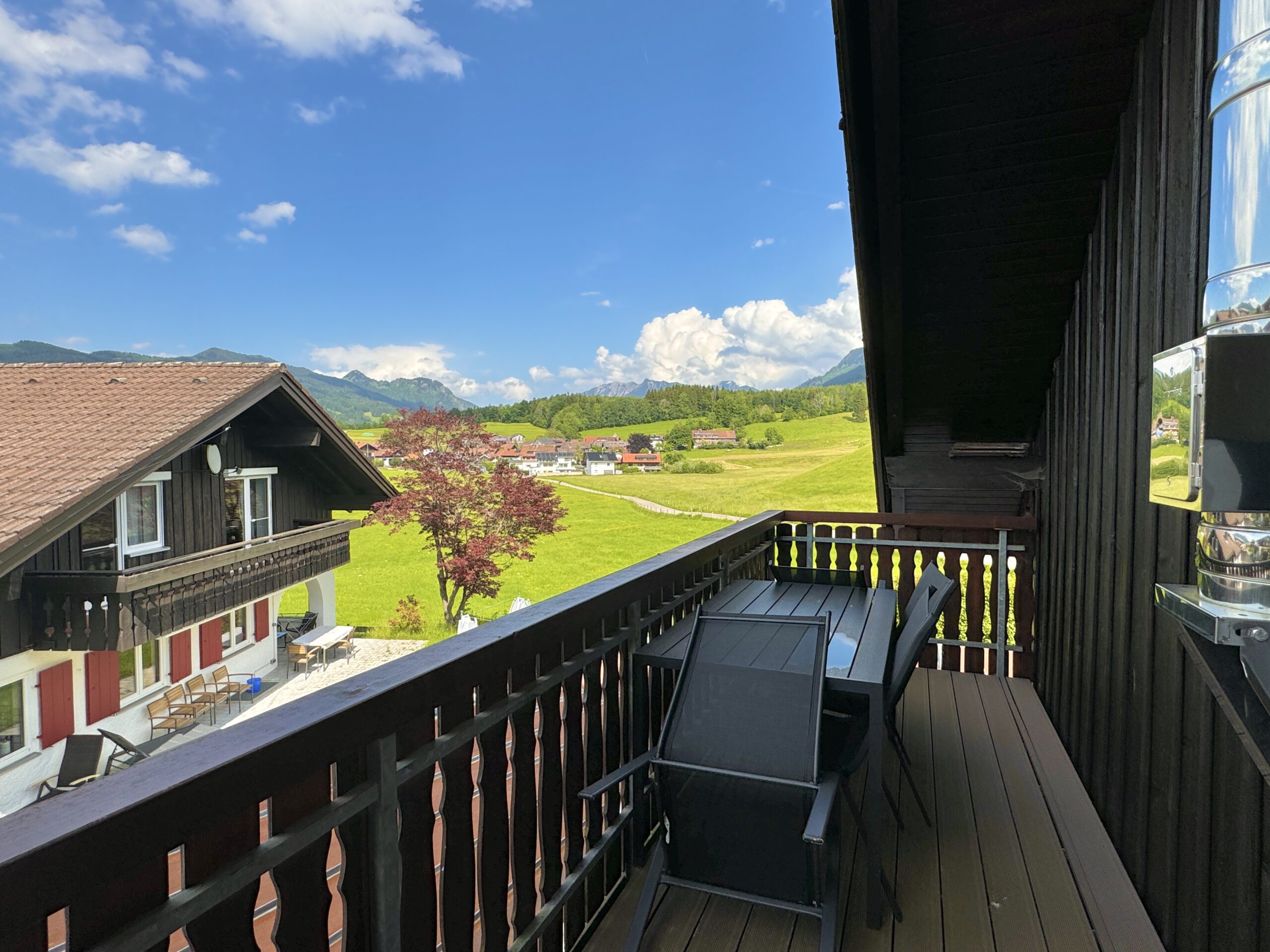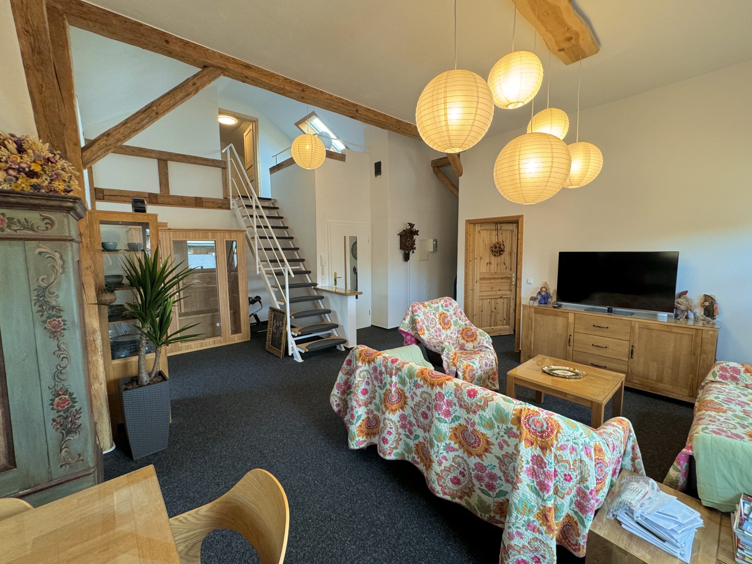 Die Wohnung umfasst insgesamt ca. 82 m2, aufgeteilt auf einen großen und offenen Wohn- und Essbereich mit Zugang zum Balkon mit Blick Richtung Grünten, ein Badezimmer mit Badewanne, Dusche, WC und Bidet, ein Schlafzimmer im unteren Bereich, ein Schlafzimmer im oberen Bereich + eine kleine Arbeits- oder Leseecke auf der Galerie. Die neu eingebaute Einbauküche im hochwertigen Landhausstil fügt sich, samt dem dazu passenden Esstisch, wunderbar in die Wohnung ein! Der große Wohnraum ist ebenso mit einem gemütlichen Specksteinofen ausgestattet. Man fühlt sich sofort wohl! Vom Wohnzimmer heraus bekommt man Zutritt auf den großen Balkon. Von hier aus kann man die Umgebung in vollem Umfang, gerade nach einem stressigen Tag im Sommer genießen.
