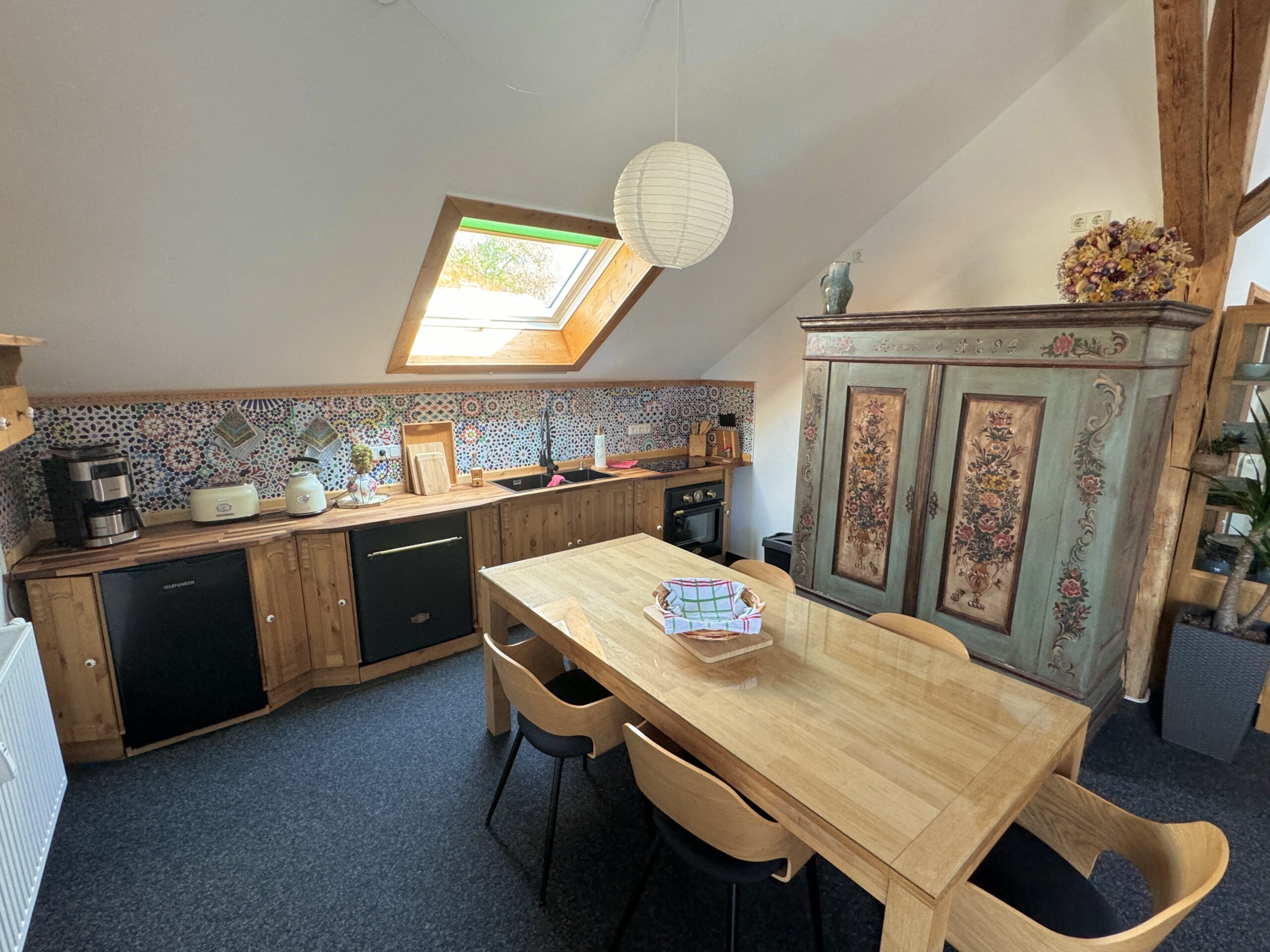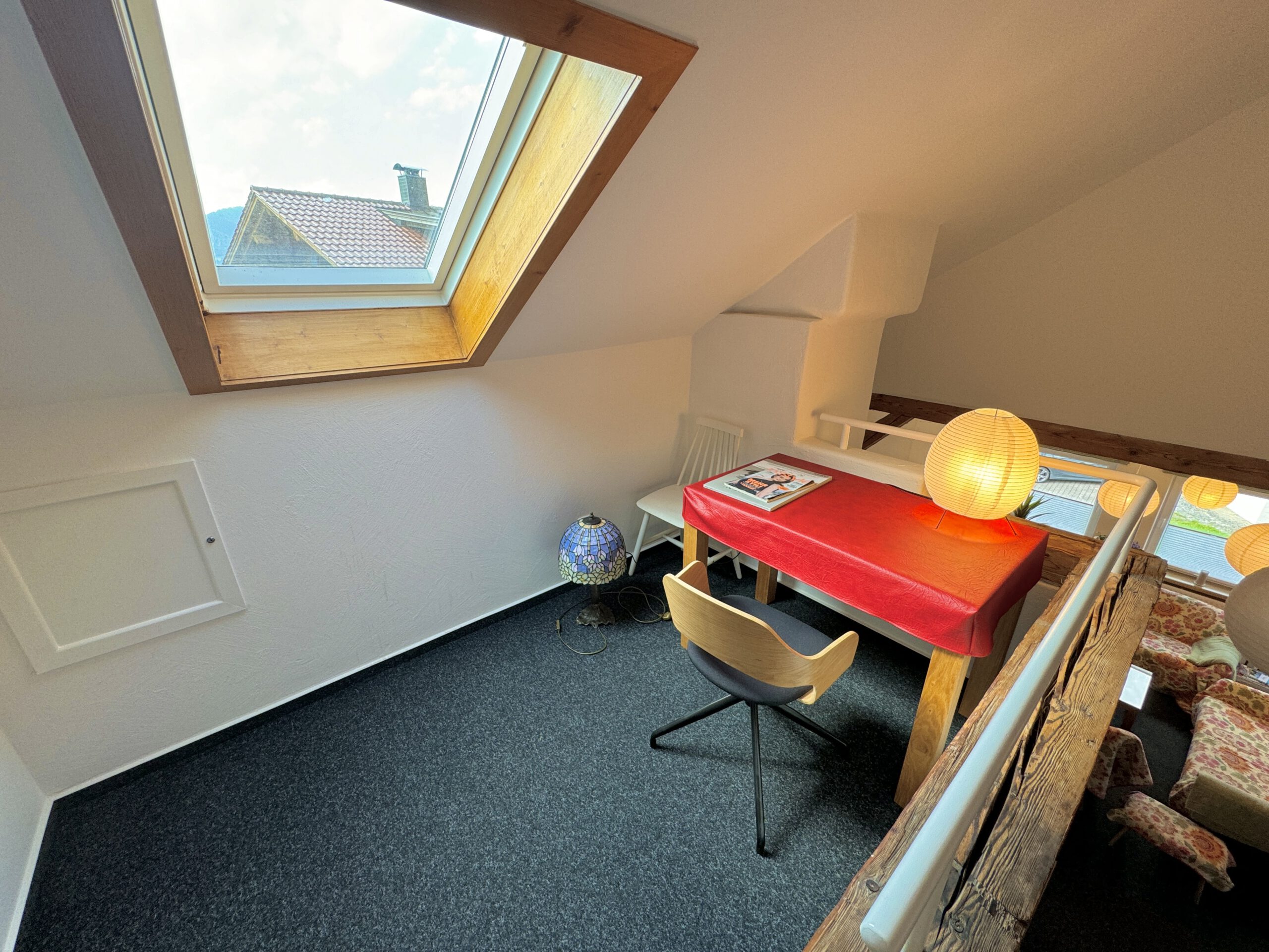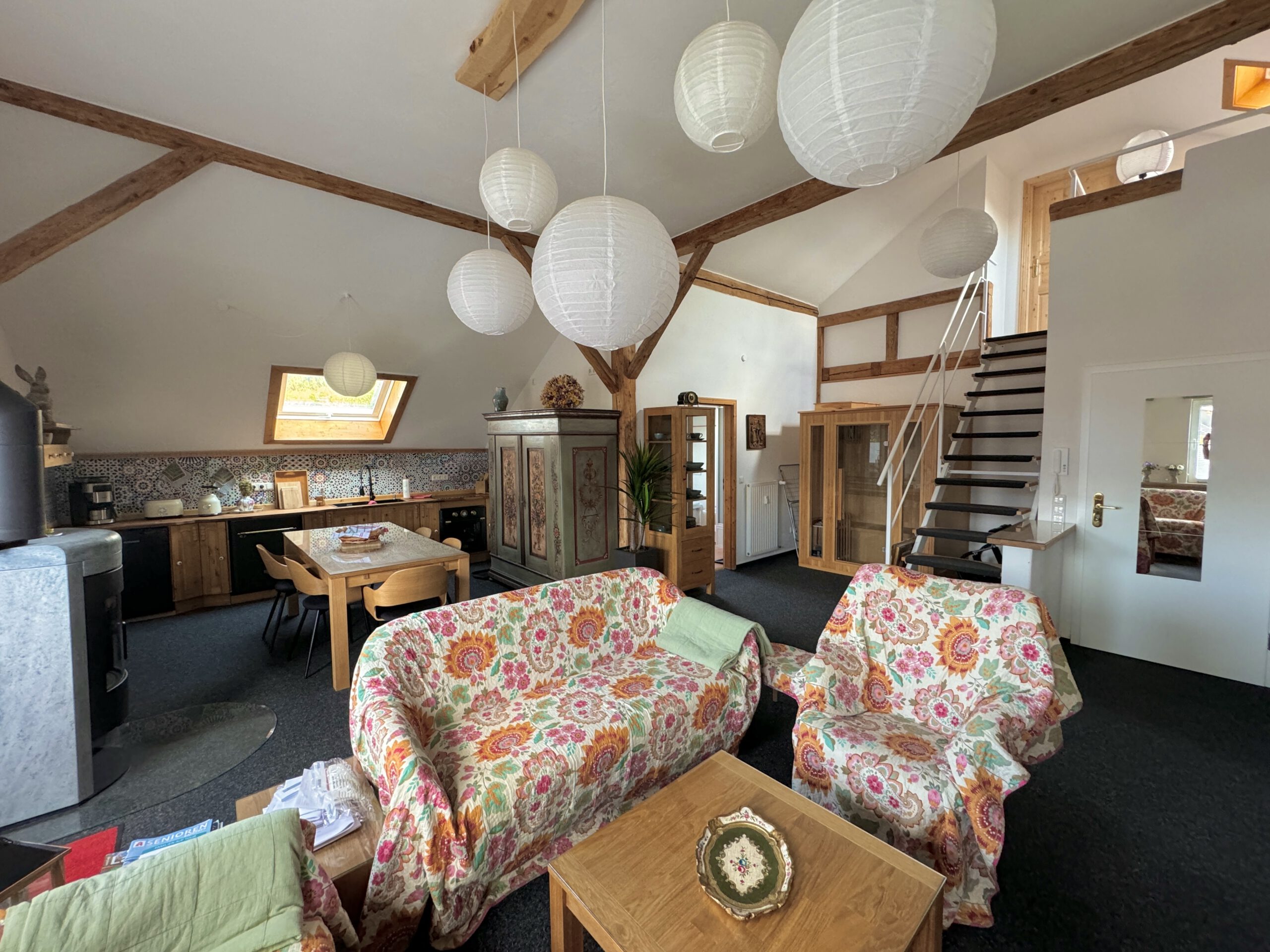 Die Wohnung umfasst insgesamt ca. 82 m2, aufgeteilt auf einen großen und offenen Wohn- und Essbereich mit Zugang zum Balkon mit Blick Richtung Grünten, ein Badezimmer mit Badewanne, Dusche, WC und Bidet, ein Schlafzimmer im unteren Bereich, ein Schlafzimmer im oberen Bereich + eine kleine Arbeits- oder Leseecke auf der Galerie. Die neu eingebaute Einbauküche im hochwertigen Landhausstil fügt sich, samt dem dazu passenden Esstisch, wunderbar in die Wohnung ein! Der große Wohnraum ist ebenso mit einem gemütlichen Specksteinofen ausgestattet. Man fühlt sich sofort wohl! Vom Wohnzimmer heraus bekommt man Zutritt auf den großen Balkon. Von hier aus kann man die Umgebung in vollem Umfang, gerade nach einem stressigen Tag im Sommer genießen.