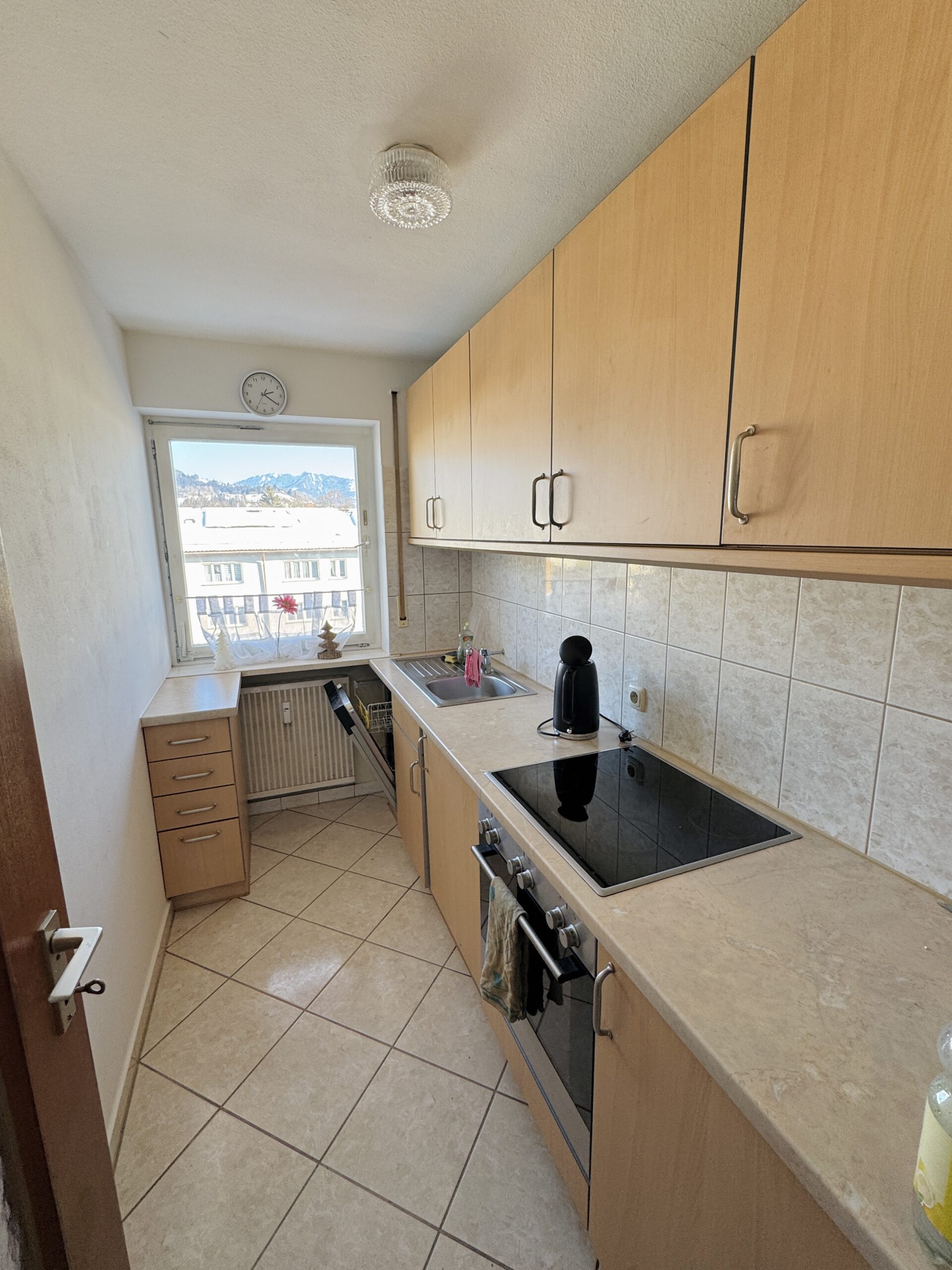 Die Wohnung dient mit praktischer Aufteilung für eine angenehme Wohnatmosphäre. Der großzügige Wohnbereich bildet das Herzstück der Wohnung und bietet Zugang zum Westbalkon mit schönem Blick auf die Hörnerkette – ideal für sonnige Nachmittage und entspannte Abendstunden. Ein praktischer Flur mit Einbauschrank bietet zusätzlichen Stauraum. Die separate Küche ist mit einer Einbauküche ausgestattet und ist im Preis inkludiert. Das Badezimmer verfügt über Dusche und WC. Neben dem großen Schlafzimmer steht ein weiteres, kleineres Zimmer zur Verfügung, das sich ideal als Kinderzimmer, Büro oder Gästezimmer nutzen lässt. Sämtliche Fenster sind mit Rollläden ausgestattet.
